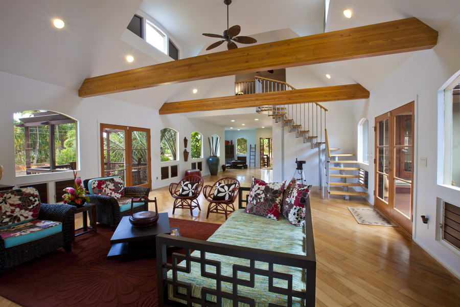 The Anahola Beach House is one of those homes that sparkels… one of those homes that you step foot in and never, ever want to leave! Here you will find an escape from the noisy, crowded world you left behind. This lovely home offers sloping roofs, Hawaiian/Asian architecture, stucco exterior and ocean views from the living area, dining and front lanai, along with delightful gardens and lawns on its ½-acre setting make it unique among rental homes (also biggie: Air Conditioning!!!). The home is directly across the street from the beach, so grab your suits, grab your sunscreen and join us in proudly welcoming the Anahola Beach house to our collection of Kauai Vacation Properties.