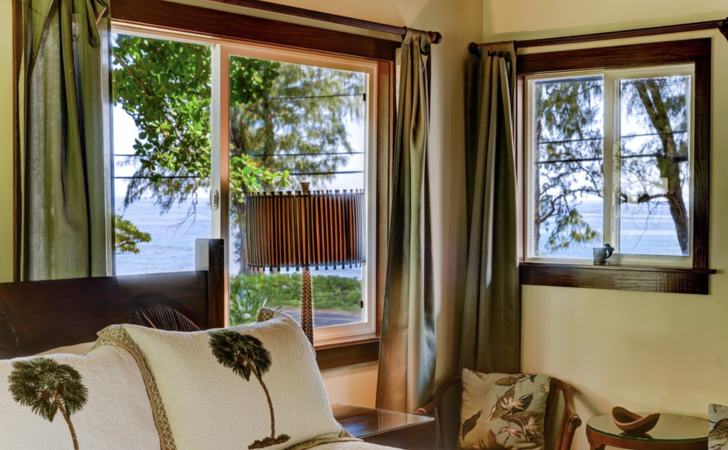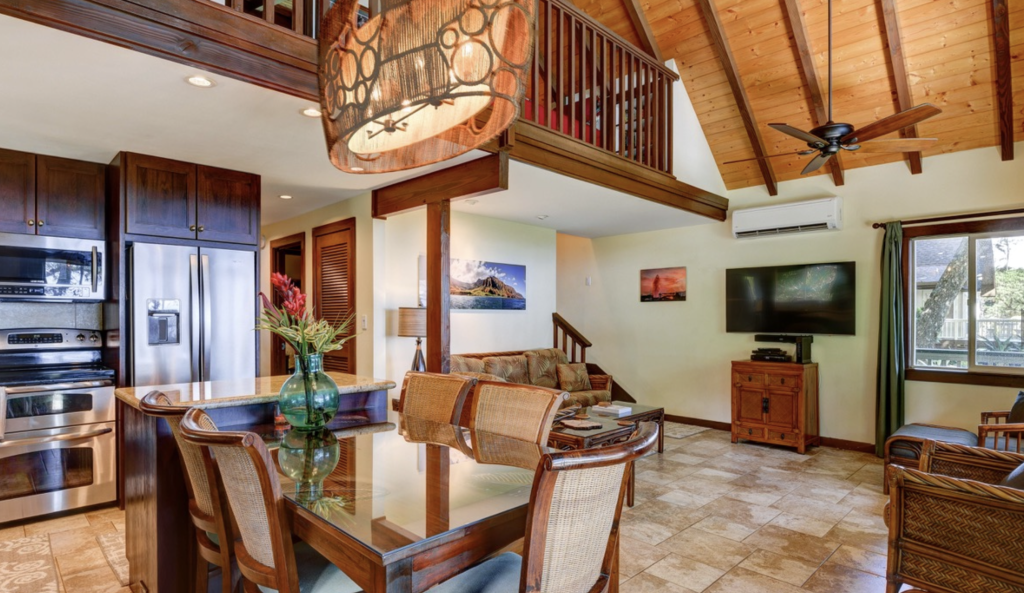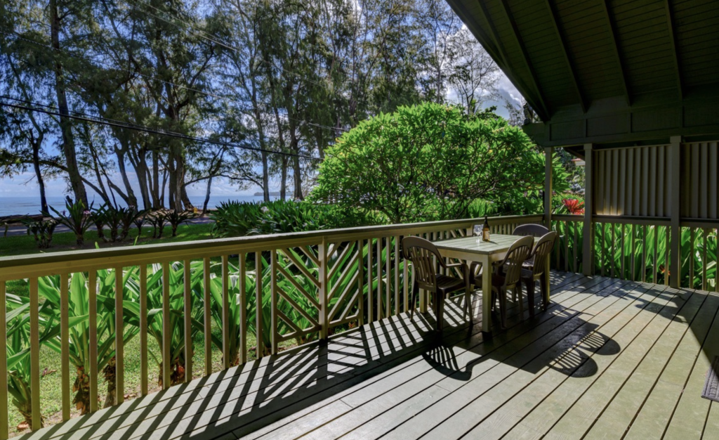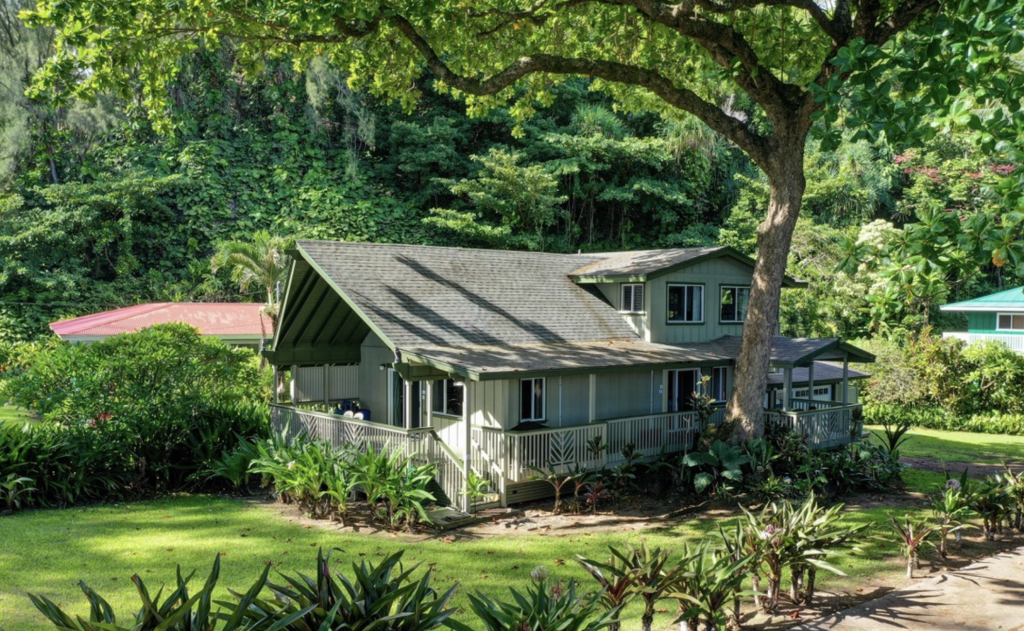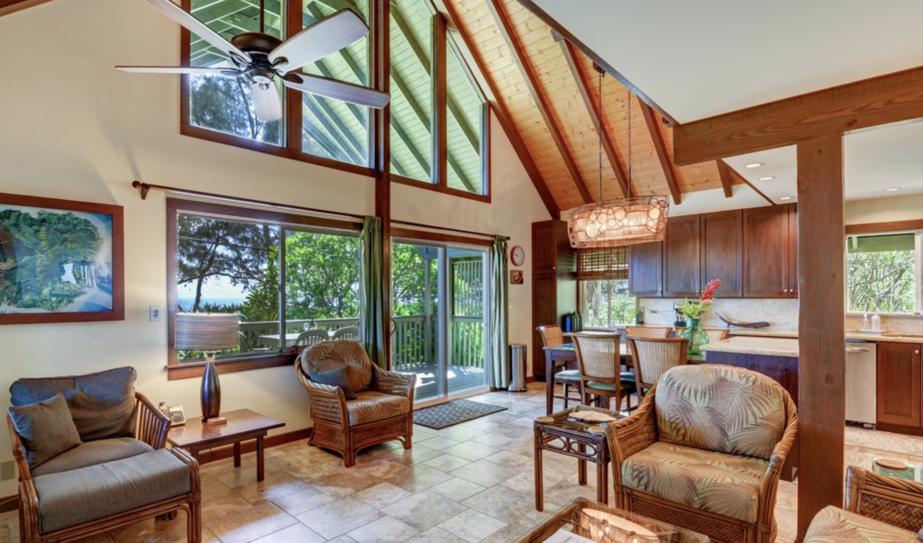 The home’s location places visitors between the dramatic cliffs of the Napali Coast and the lush taro fields of Hanalei Valley, making it a perfect base for exploring Kauai’s north shore beaches, scenic hiking trails, and world-famous coastal views.
