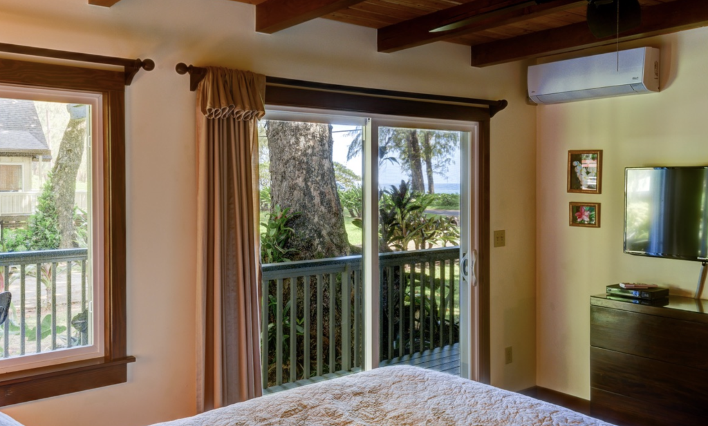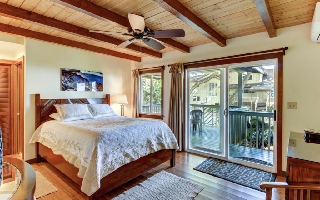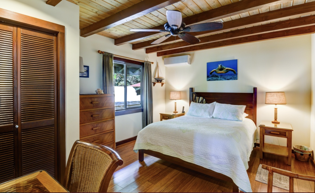 The home includes three comfortable bedrooms that serve as quiet retreats at the end of the day. Each bedroom features air conditioning, quality linens, and upgraded bedding to ensure restful nights surrounded by the peaceful atmosphere of Haena.