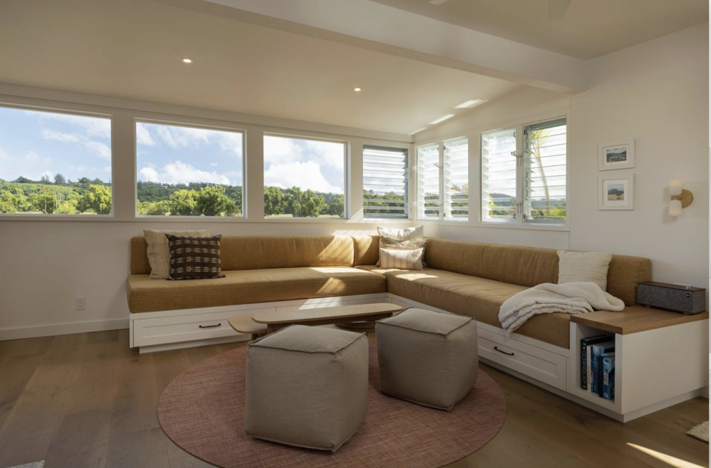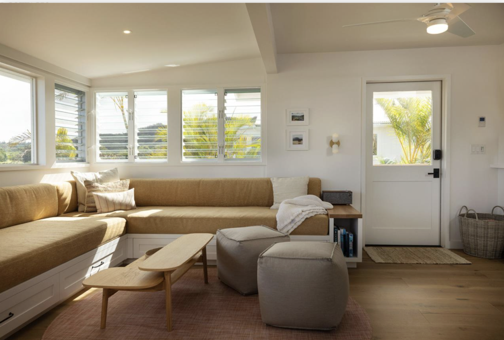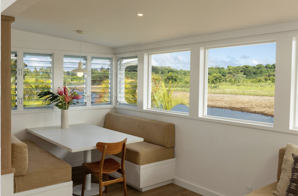 Cottage three (716 sq ft) is an inviting kauai vacation rental ideal for friends or families traveling together. this two-bedroom retreat features a wraparound living room sofa that converts into additional sleeping space, offering flexibility and comfort for your stay. Natural light fills the open interior through river-view windows, creating a relaxed island atmosphere throughout the home. The dining area seats up to six and connects seamlessly to a fully stocked chef’s kitchen, making shared meals easy and enjoyable. step outside to your private riverside lanai and enjoy effortless access to bike rides and outdoor adventures along kauai’s north shore.