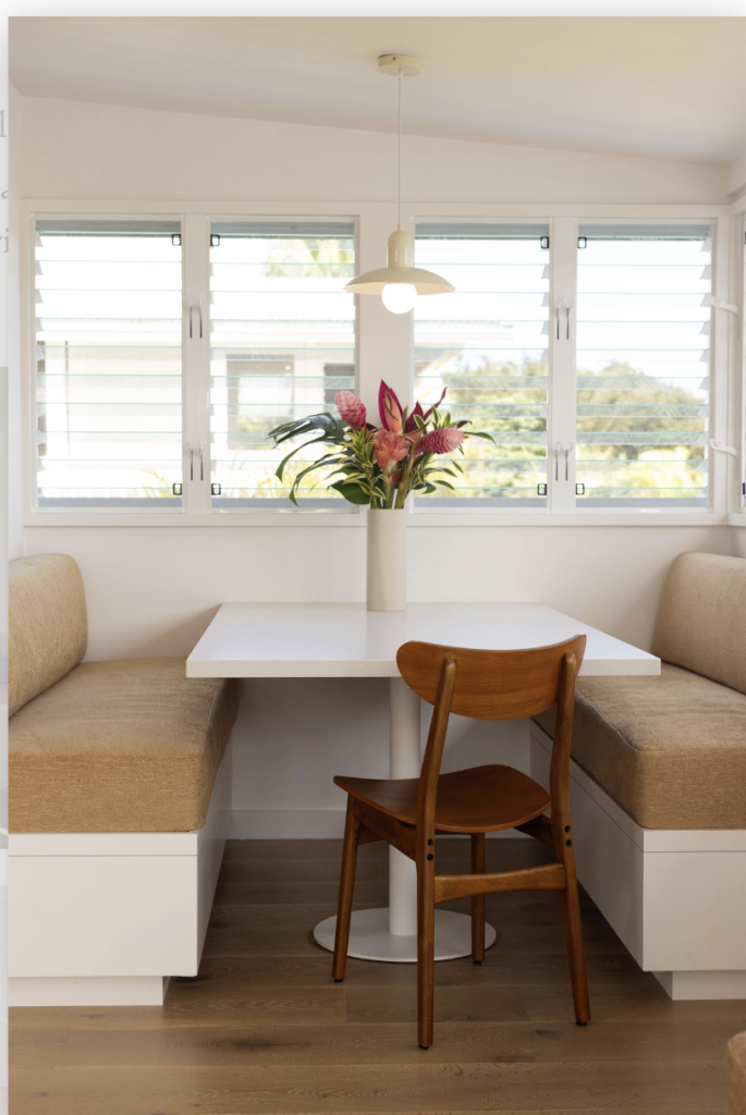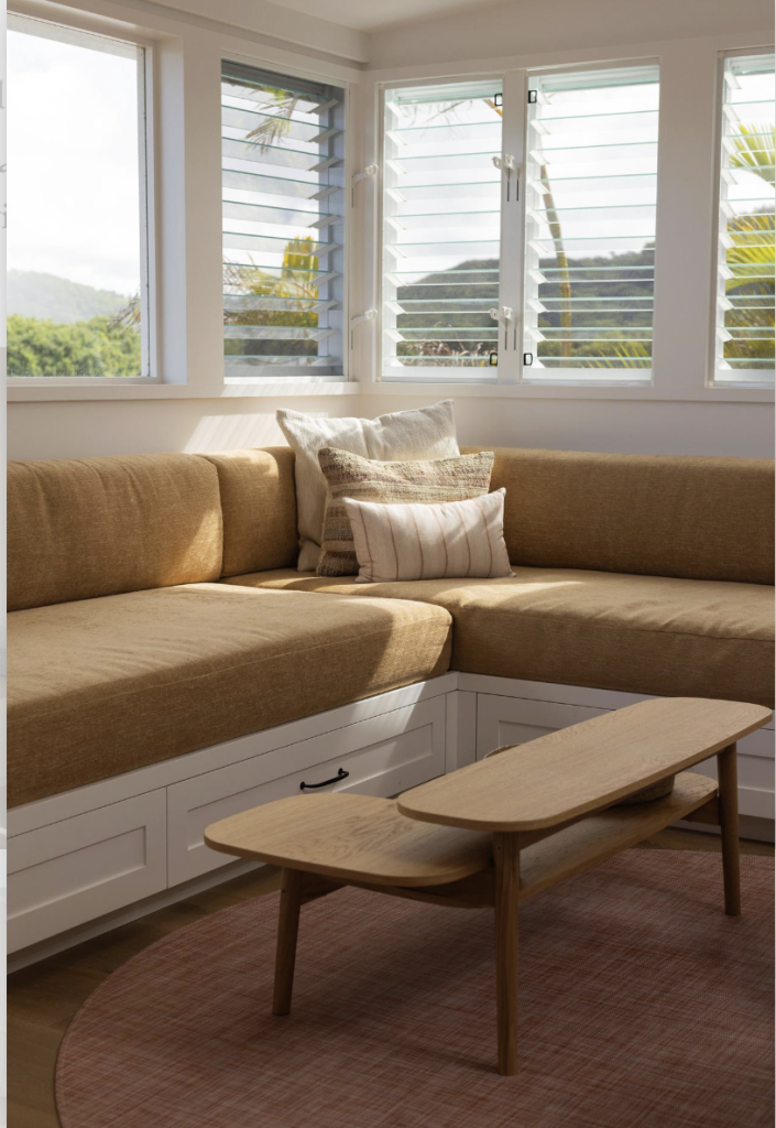 Designed for connection and everyday comfort, the open-plan living and dining spaces are perfect for gathering together. a built-in dining booth offers peaceful river views, while the l-shaped sofa invites you to unwind with a book or enjoy a favorite show, day or night.