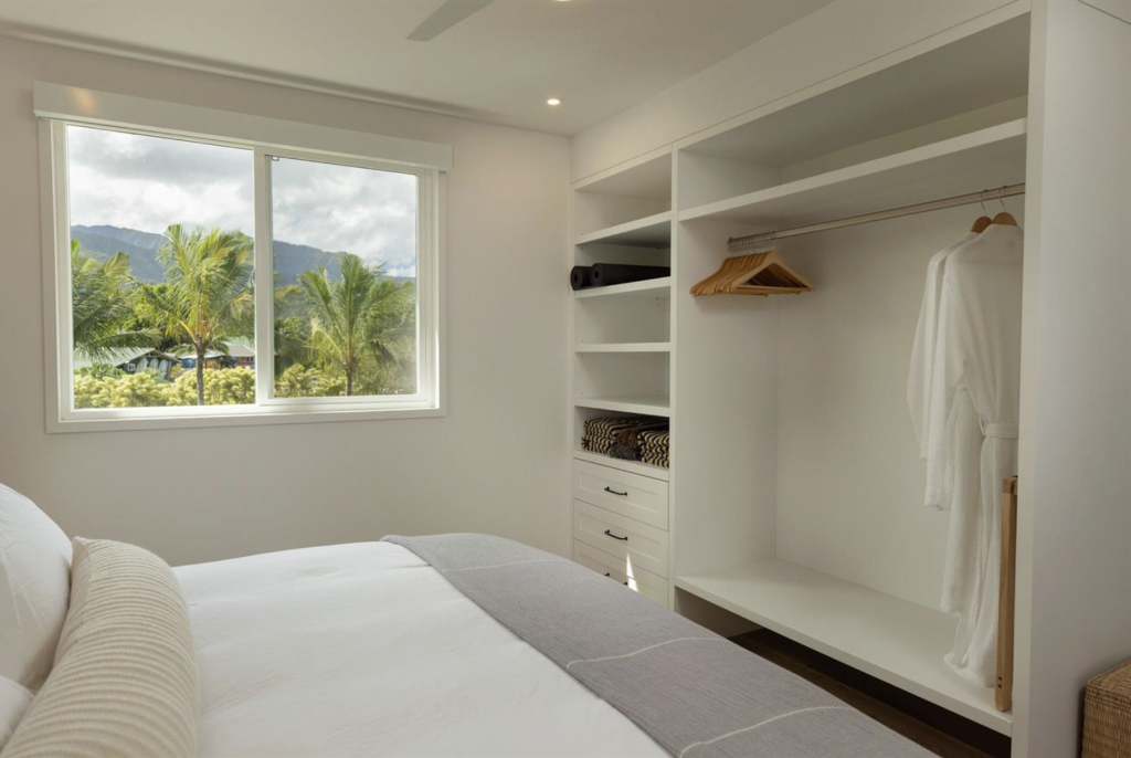 The main bedroom offers a calm retreat after a day exploring hanalei. enjoy serene mountain and garden views, an organic king bed with plush bedding, generous closet space, and a desk for staying connected while on vacation.