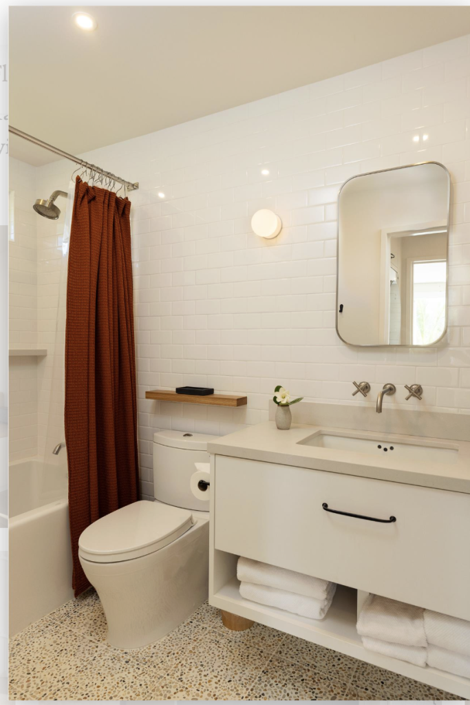 The main bathroom features spa-inspired design with terrazzo flooring, natural light from a privacy window, a dual vanity, and a rainfall shower. plush towels and quality bath products add to the relaxing experience.