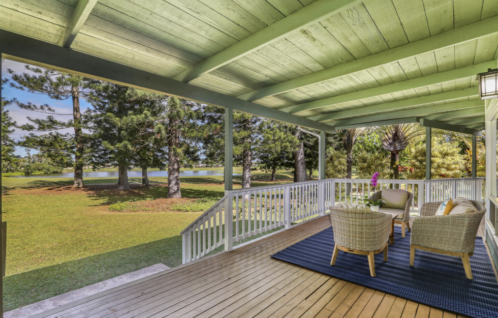Off of the main living space is the wide, covered lanai that naturally draws you to outdoor living, immersing you in tropical golf course and lake views full of pine trees and tropical landscape. Old-growth Norfolk Pines in the backyard offer the perfect amount of privacy and seclusion for your afternoon nap out back. Enjoy a cup of Kauai coffee as the tropical breeze and lake views entice your senses. The deck also features a large dining table, a small sofa with chairs and a gas BBQ grill.