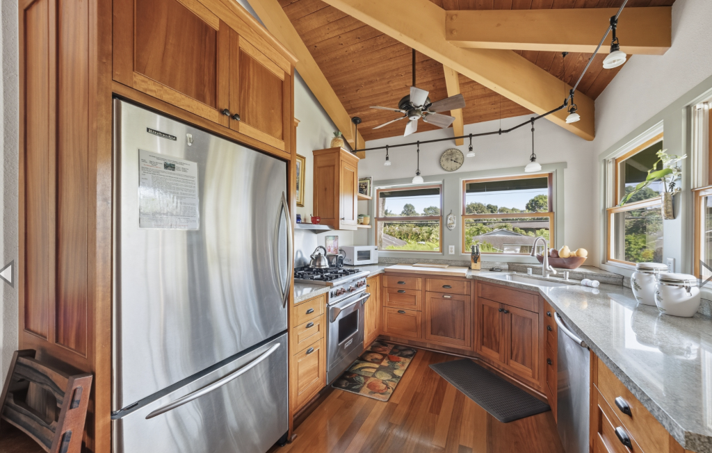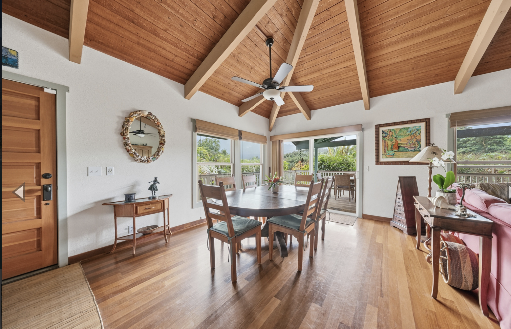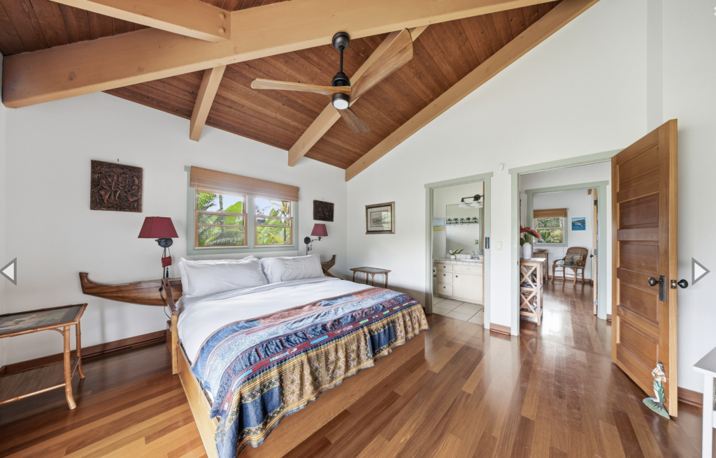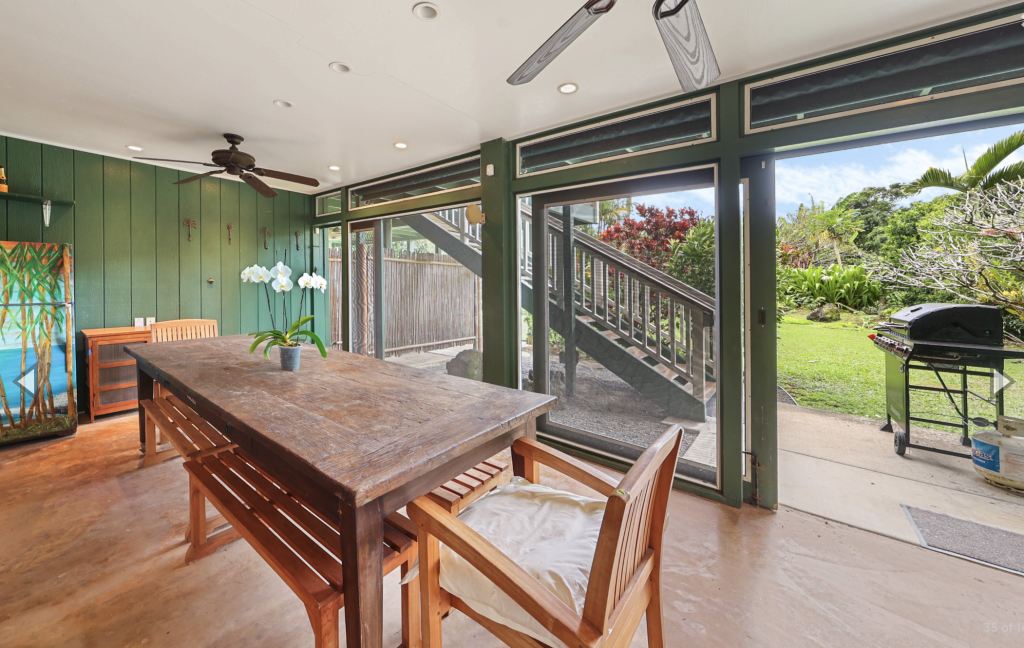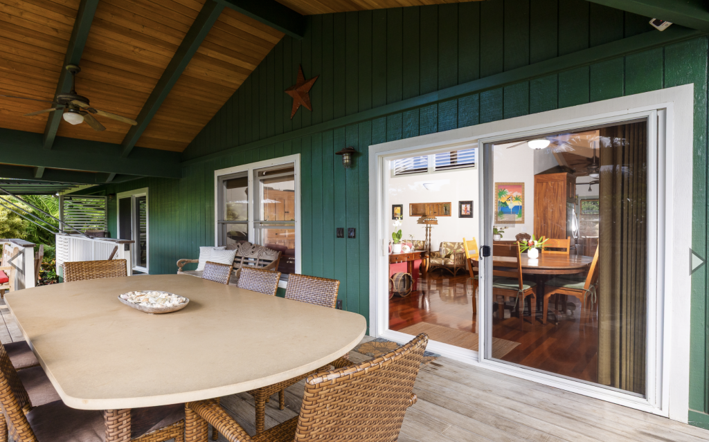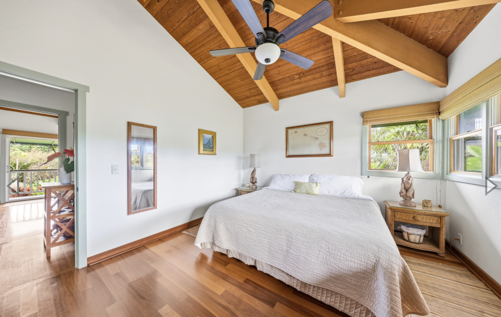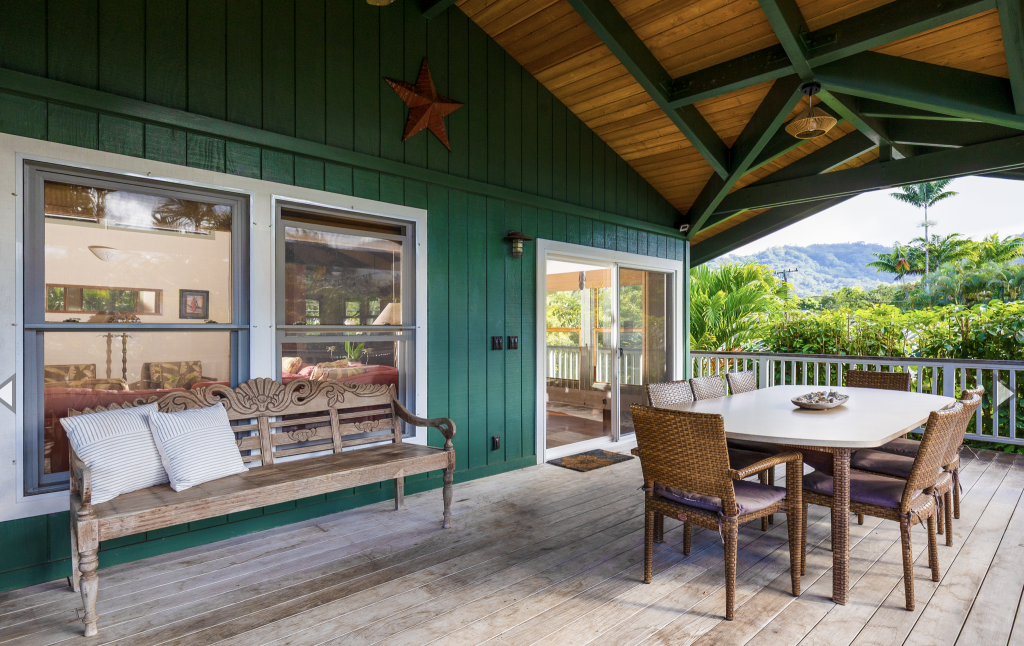 Enjoy your meals or a good book on the covered lanai with it’s oversized dining table and comfortable benches, chairs and lounges. Wander around the corner to the Farmer’s Market on Saturday. Enjoy walks on Hanalei day or night! Summer time swimming or winter time surfing make Hanalei a perfect year round destination.