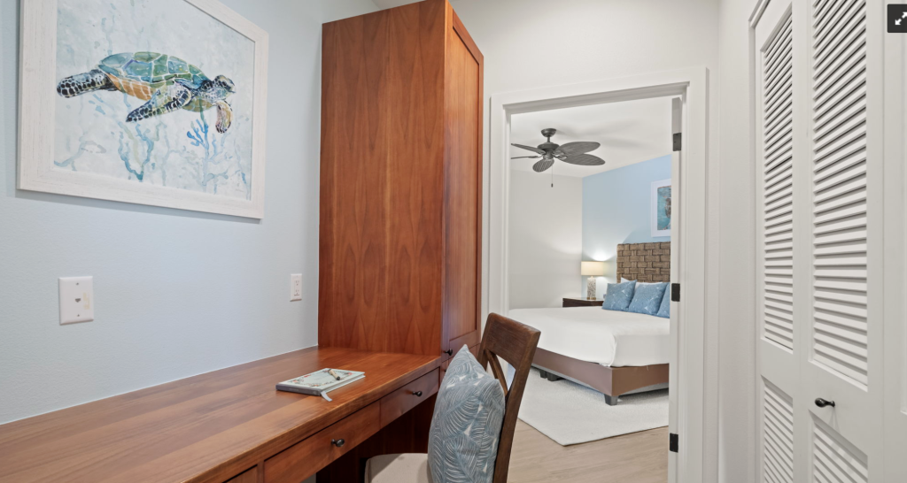 Executive office area adjacent to the second bedroom with desk, chair, and storage