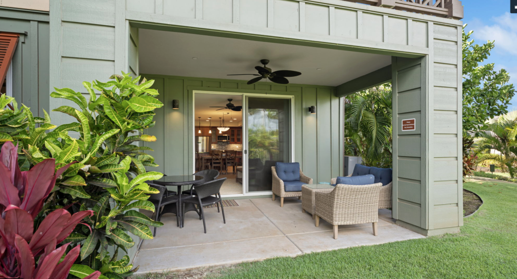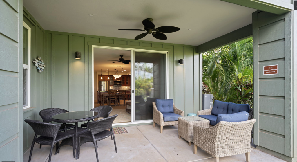 Covered lanai with dining and lounge space