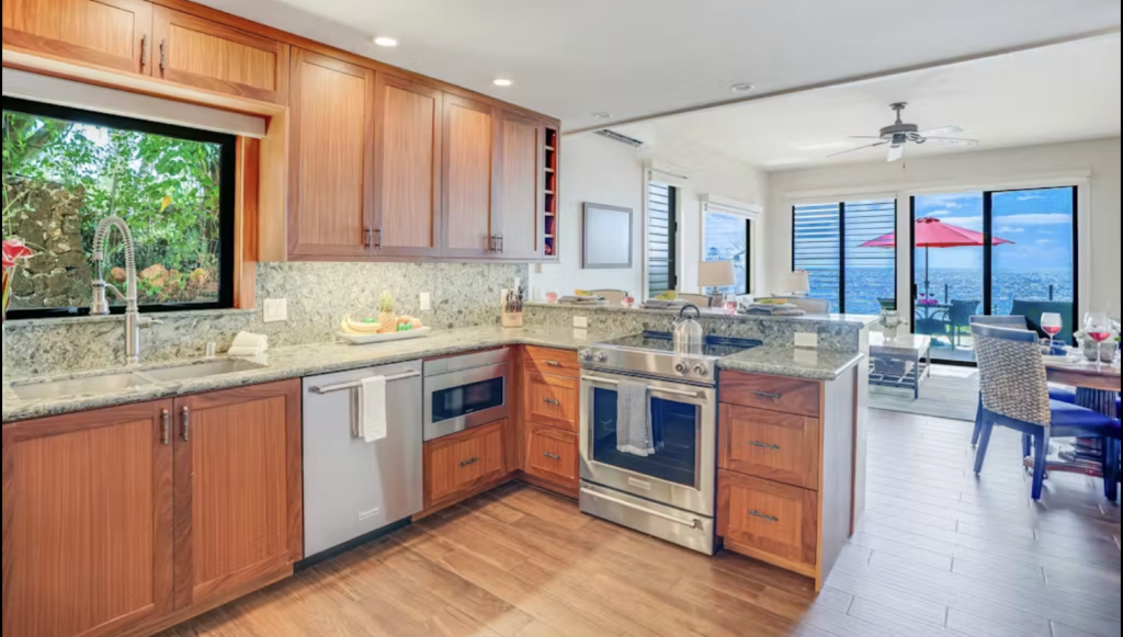 Prepare meals while watching the Pacific shimmer just beyond the windows.